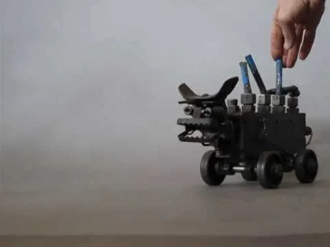 Animal made from recycled gin trap and manifold with steel wheels. When pushed along its head turns from side to side and mouth opens and closes.
